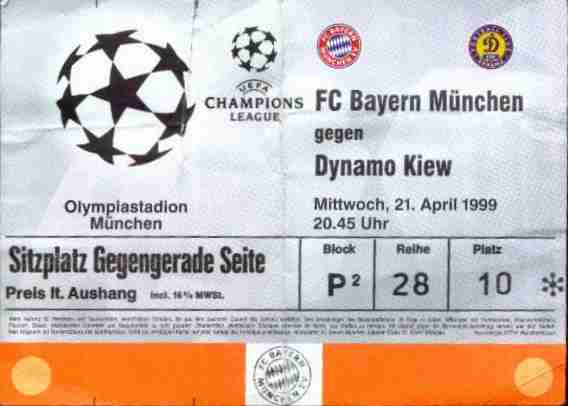 Wenn man schonmal in München ist, kann man natürlich auch das Championsleague-Halbfinale mitnehmen, selbst wenn das keinen neuen Ground bedeutet. Kiew (oder, wie es sich selbst schreibt "Kyiv") müht sich redlich und hat auch einige gute Chancen, aber Oliver Kahn und ein Kunstschuß von Mario Basler zeigen den Weißrussen ihre Grenzen und bringen die Bayern ins Finale gegen ManUnited, das einen 0:2-Rückstand bei Juve noch zu einem 3:2-Sieg macht.