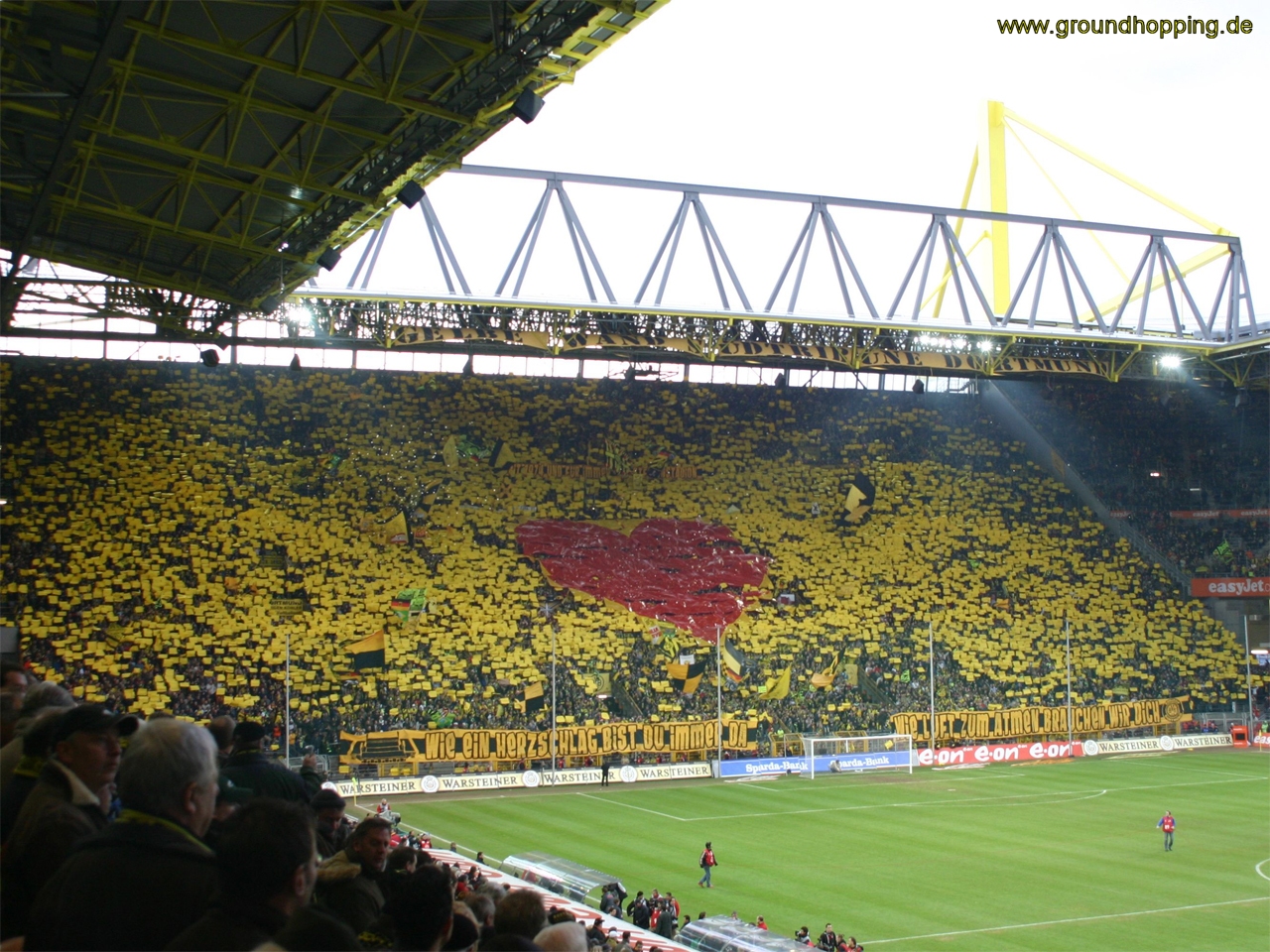 Zum Auftakt gibt es von Seiten der Borussia-Fans eine Choreographie, bei der mit Plastikbändern ein rotes Herz auf gelbem Grund gezeigt wird und mit Papptafeln für eine ansonsten komplett gelbe Südtribüne gesorgt wird. Mit den Transparenten "Seit 1974 und