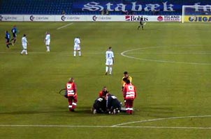 tragen ihn vom Platz, er wird am Rand behandelt, während das Spiel